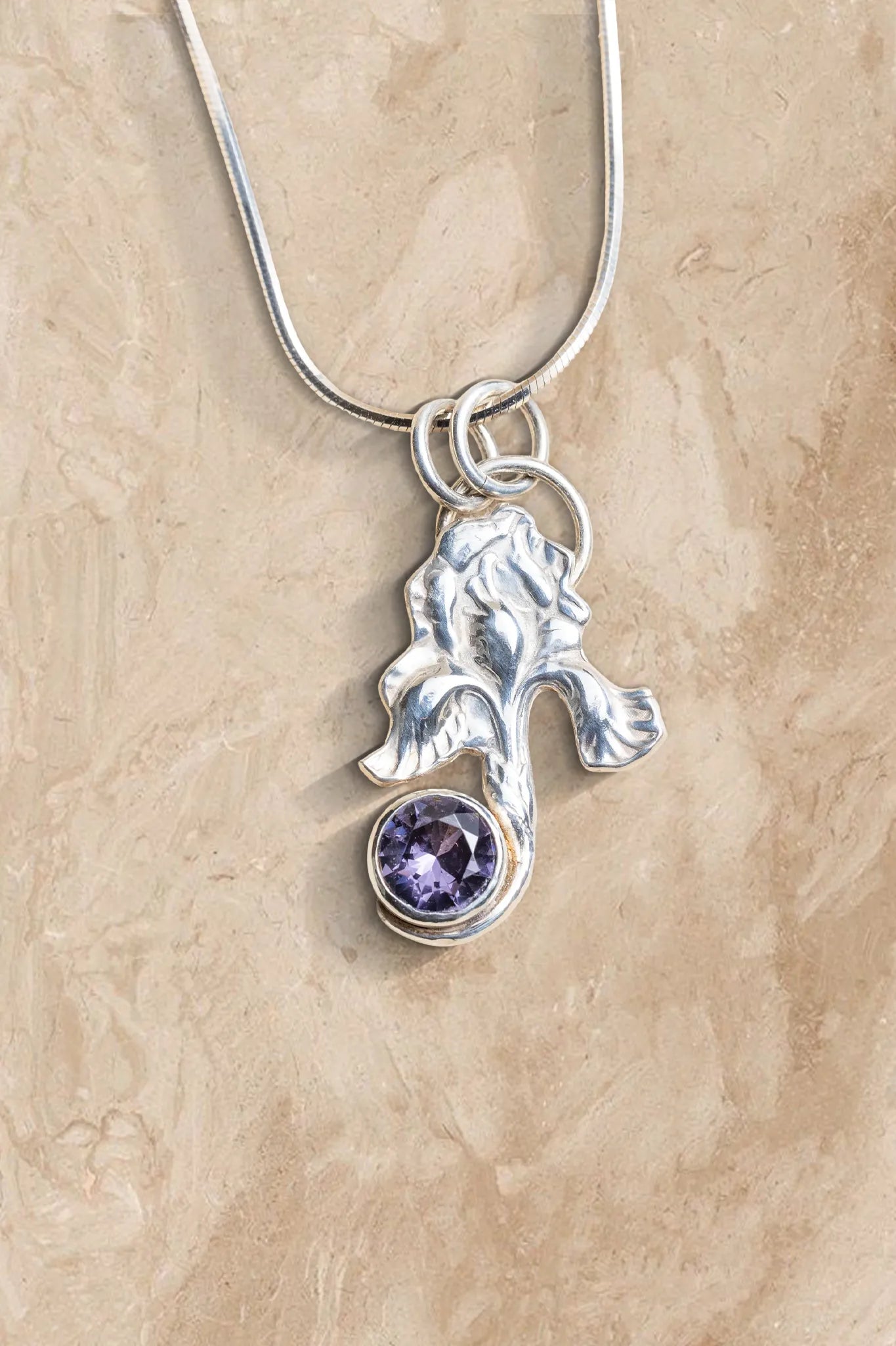Fine Silver iris encompasses a 7.8 mm purple amethyst. Amethyst is known as the sober stone and is said to keep the wearer quick-witted in battle and business.