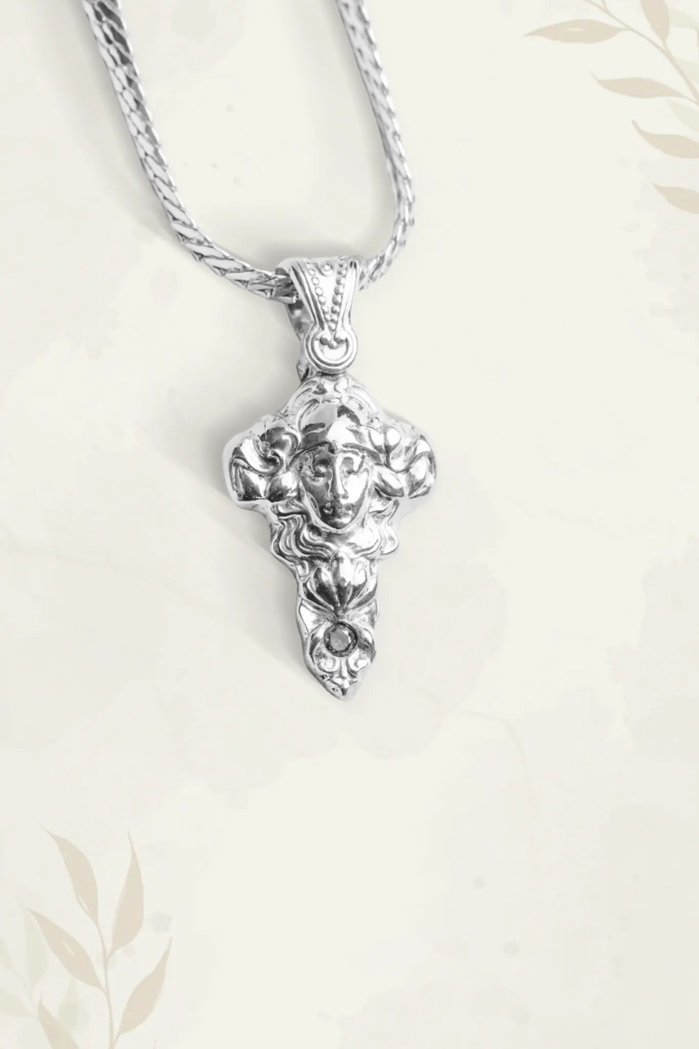 Solid Fine Silver maiden with flush set 2 mm Rhodolite Garnet. This deep pink stone represents love, compassion, and spiritual growth.
