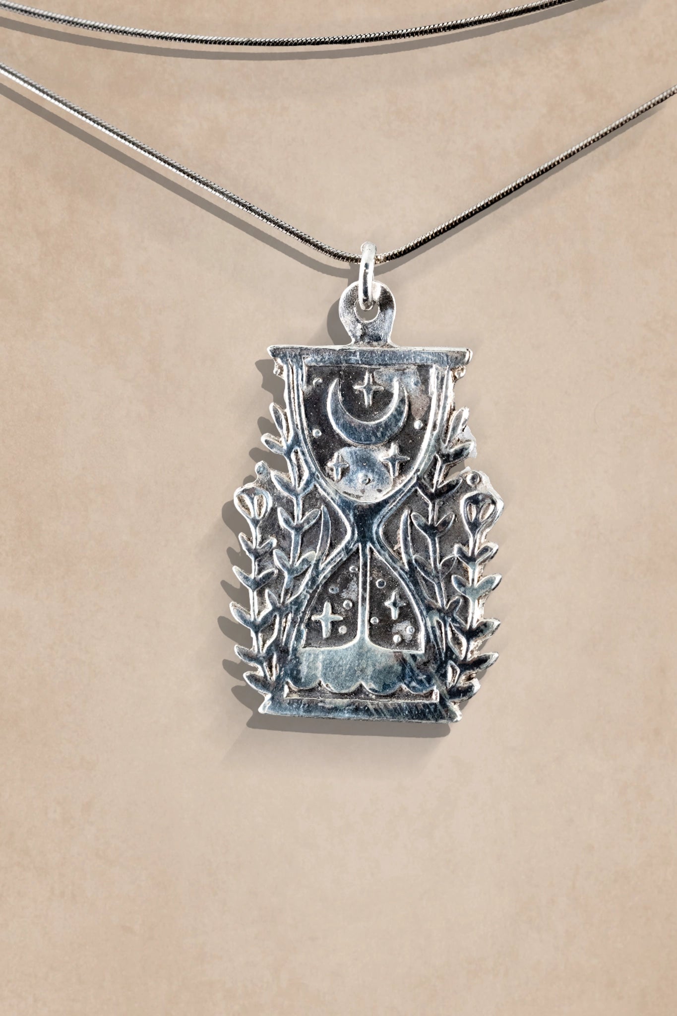 The Celestial Hourglass Pendant symbolizes the passage of time and the harmony between earth and sky. Crafted in fine silver, it features an engraved hourglass adorned with crescent moons, stars, and botanical motifs—reminders of balance, growth, and the cyclical beauty of life.
