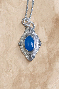 This bold Art Deco inspired pendant is steeped in quiet strength, protection, and poise. Handcrafted from solid fine silver, this striking pendant features a luminous blue chalcedony cabochon. The surrounding silverwork, inspired by the shape of an ancient shield, is intricately detailed with rope and geometric accents, merging timeless craftsmanship with contemporary elegance. The smooth, polished chalcedony is known for its soothing energy that anchors confidence.
