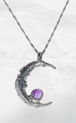 A sculptural crescent moon in fine silver curves gracefully around a faceted amethyst, its violet glow evoking intuition and inner calm. Rich with movement and organic detail, this handcrafted pendant draws on lunar symbolism—cycles, transformation, and quiet strength. Worn close to the heart, it serves as a modern amulet, both elegant and expressive, for those who move in rhythm with the moon.
