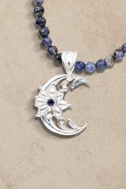 Fine Silver crescent moon 1.17” x .63” with flush set 3 mm Iolite on Iolite necklace weight.