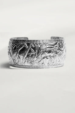 Sterling Silver bracelet imprinted with giraffes and elephants in a jungle motif.
