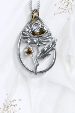 The Framed Peony Pendant captures the timeless beauty of nature handcrafted in fine silver and framed by an open teardrop of sterling silver. This piece features a graceful peony in full bloom—its petals softly detailed with luminous 24K gold accents that catch the light. Peony’s symbolism of prosperity, love, and renewal makes it a meaningful keepsake as well as a striking adornment.