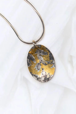 Fine silver concave oval with 24K gold and black patina in camouflage design on 18” sterling silver chain.Width .864” Length 1.63”