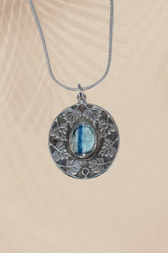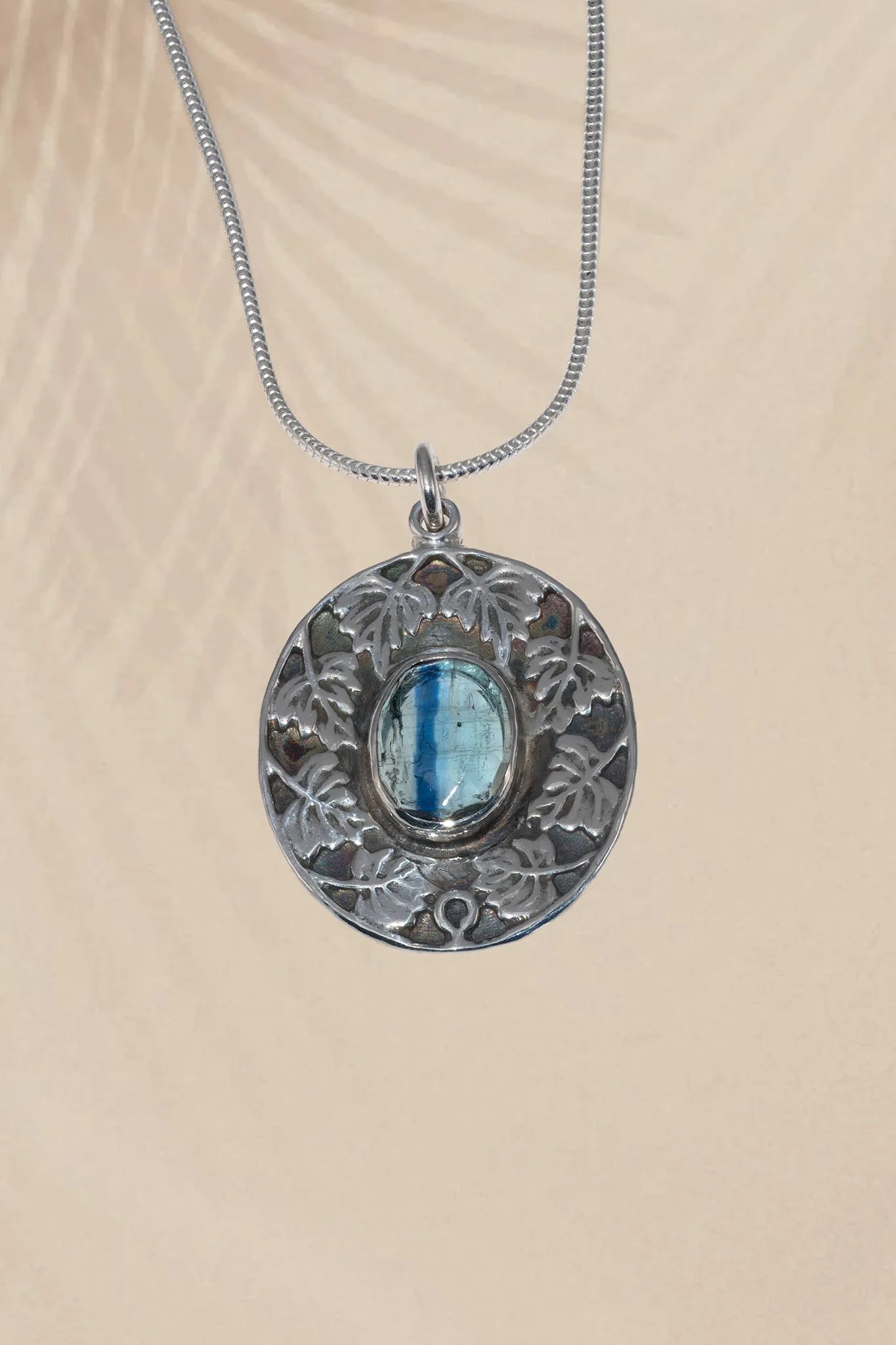 This handcrafted sterling silver pendant features a luminous bi-color tourmaline framed by delicately sculpted leaves in an Art Nouveau–inspired design. The organic detailing celebrates growth and renewal, while the natural color variation within the stone evokes shifting light through foliage. Elegant yet richly symbolic, this pendant is designed to be worn as a quiet talisman—honoring the harmony of nature, craftsmanship, and enduring beauty.