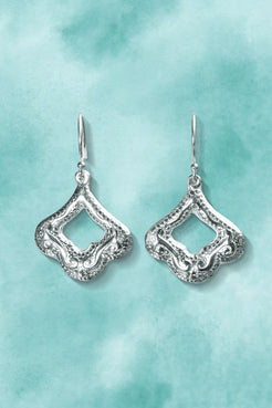 Fine Silver open center triangle shaped earrings with Moroccan inspired design. These lightweight drop earrings are on sterling silver ear wires.